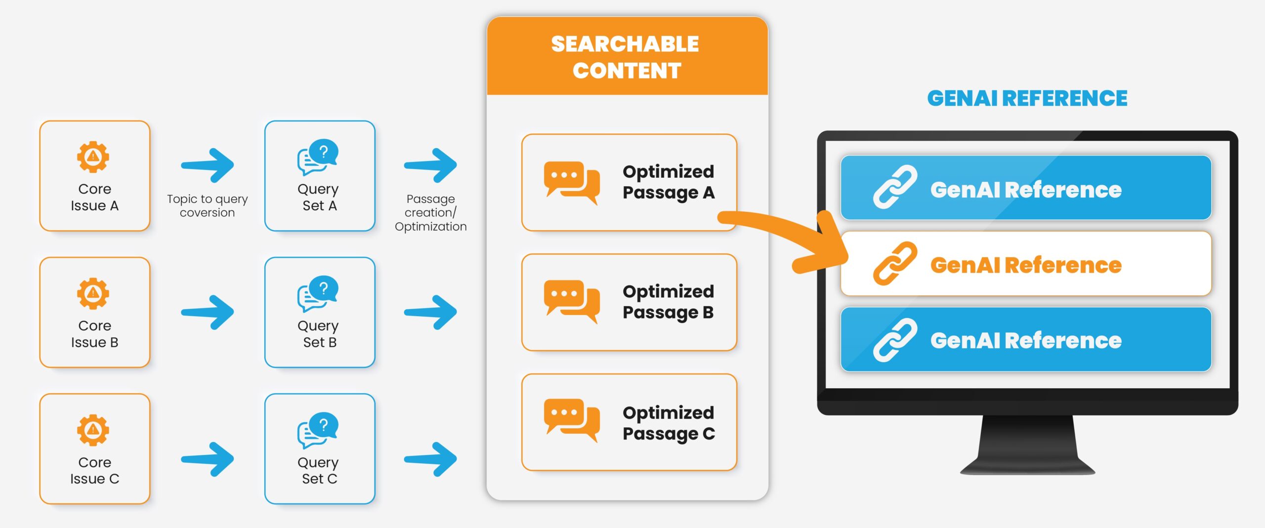 POP starts by identifying core issues for a specific topic relevant to a company’s prospects. POP then analyzes these issues, and from this analysis, determines search intent and the potential queries that an AI-based search would bring to the fore. The passage optimization and the writing of the content itself follow these initial steps.