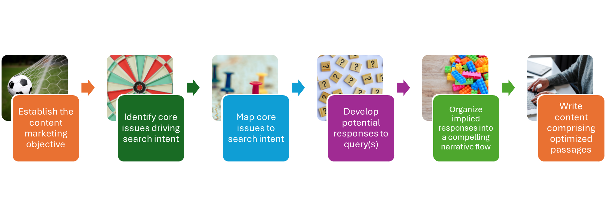 POP comprises a six-step process that identifies core issues at the heart of search intent. Search intent translates into queries, which the passages in the final content must implicitly answer.
